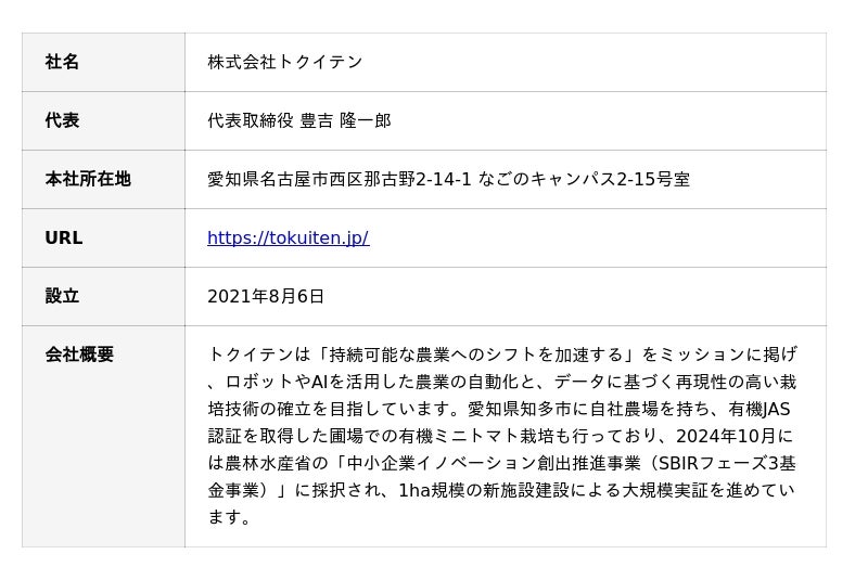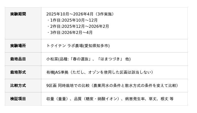 株式会社トクイテン(本社:愛知県名古屋市、代表取締役:豊吉 隆一郎、以下「トクイテン」)とノリタケ株式会社(本社:愛知県名古屋市、代表取締役社長:東山 明、以下「ノリタケ」)は、ノリタケのファインバブル発生器「セラポール」を用いて小松菜での栽培実証実験を共同で実施し、栽培の結果をとりまとめました。本実証実験は、2025年10月から2026年4月にかけて愛知県知多市のトクイテン ラボ農場にて実施したもので、有機農業※1における収量・品質・病害予防につながる成果を得ました。