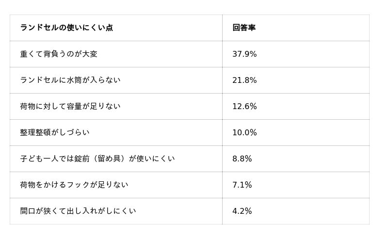 2.「水筒が入らない」「錠前が使いにくい」など、ランドセルの使いにくさは複合的。