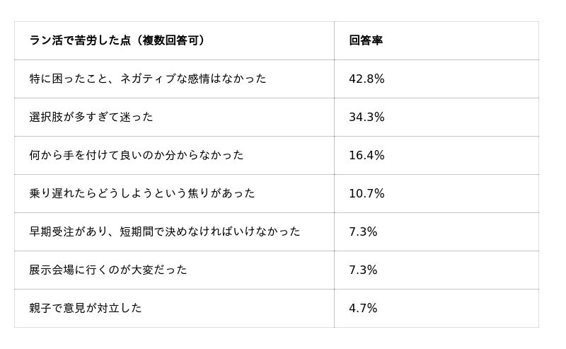 苦労した点の1位は「選択肢が多すぎて迷った」(34.3%)。一方「特に困ったことはなかった」も42.8%にのぼります。購入時期の早期化(入学1年前の4月以前:16.7%)が進む中、早期に決断を終えた層と、情報過多の中で迷い続ける層とに二極化する傾向が見られました。