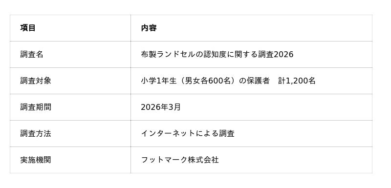 創業80周年のフットマーク株式会社(本社:東京都墨田区、代表取締役社長:磯部 徳史)は、小学1年生の子を持つ親1,200名を対象とした「布製ランドセルの認知度に関する調査2026」の結果を発表いたします。