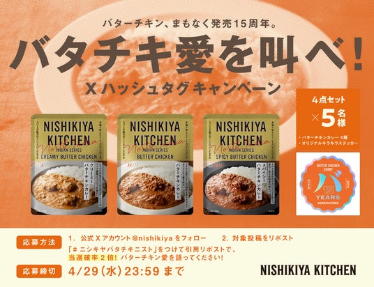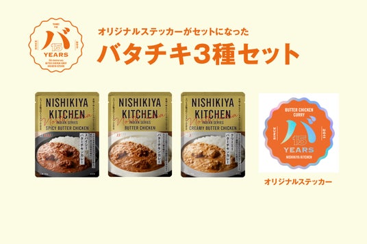「世界の料理を『カンタン』に。」をコンセプトに掲げ、レトルトカレーを中心に約120種類のレトルト食品を販売する専門店NISHIKIYA KITCHEN(ニシキヤキッチン)(株式会社にしき食品 本社:宮城県岩沼市、代表取締役社長:菊池洋一)は、ニシキヤキッチンの看板商品であるバターチキンカレー発売15周年を記念し、2026年4月23日(木)から5月13日(水)の期間限定で「バターチキンカレー15周年感謝祭(略称:バタチキ感謝祭)」を公式オンラインショップと実店舗で開催します。これまで支えていただいたお客様へ感謝を届けるべく、「バターチキンカレー」を詰め合わせた「バタチキ3種セット(ステッカー付き)」と「バタチキ15周年セット(オリジナルキーホルダー&ステッカー付き)」を期間限定で販売します。ニシキヤキッチンはこれまでカレーの本場インドに20回以上通い現地の本格的な味わいを学び、バターチキンカレーの味わいもこの15年でさらにおいしく進化をし続けてきました。長年愛され続けてきたバターチキンカレーのみならず、甘口で食べやすい「クリーミーバターチキンカレー」や辛さとスパイスの香りを楽しむ「スパイシーバターチキンカレー」3種類の「食べ比べ試食」も実店舗で開催します。