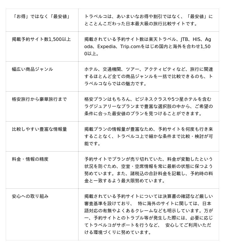 トラベルコは、これまでもこれからも「最も安く・最も便利で・最も親切に」をモットーに、皆さまの快適な旅を全力でサポートしてまいります。