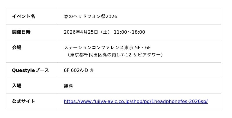 QCC Dongle Pro 2は、2026年4月25日(土)に開催される「春のヘッドフォン祭2026」のQuestyleブース(ステーションコンファレンス東京 6F 602A-D 8.)にて、世界に先駆けて展示・試聴いただけます。