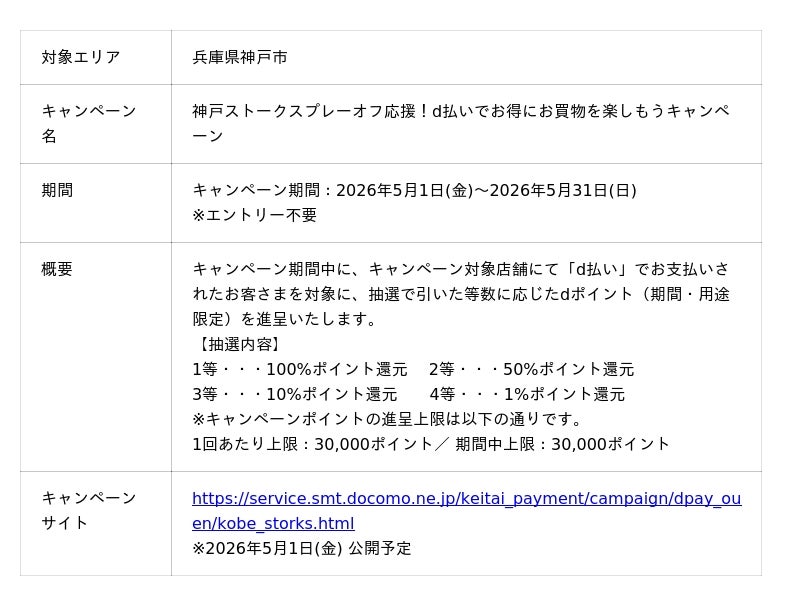 株式会社NTTドコモ(以下、ドコモ)は、全国の地域・商店街においておトクな「d払い(R)」キャンペーンを開催いたします。詳細は、下表のとおりです。