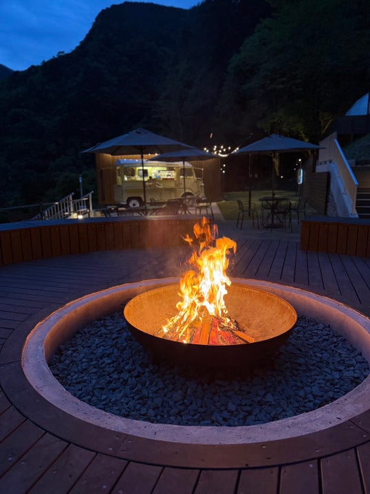 施設内には夕暮れになるとアウトドアBARがオープン。大きな焚き火(BIG FIRE)と共に夕食後の秘境の夜が楽しめたり、サウナエリアではアウトドアサウナ、アクティブなお客様には大自然を満喫可能な渓流サウナやリバーリング体験もご用意しています。