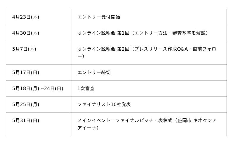 コンテストへのエントリーを検討しているスタートアップ向けに、オンライン説明会を2回開催します(いずれも平日開催)。プレスリリースの書き方から審査基準、応募方法までを解説します。プレスリリースを書いたことがないという方も大歓迎です。第1回:4月30日(木) エントリー方法・審査基準を解説