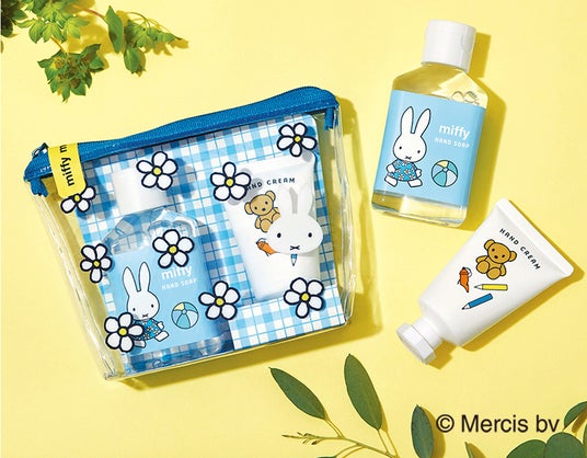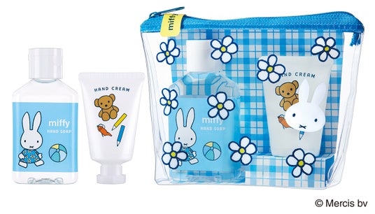 ミッフィーの愛らしいデザインが施された、花柄のクリアポーチ入りのハンドケアセット。