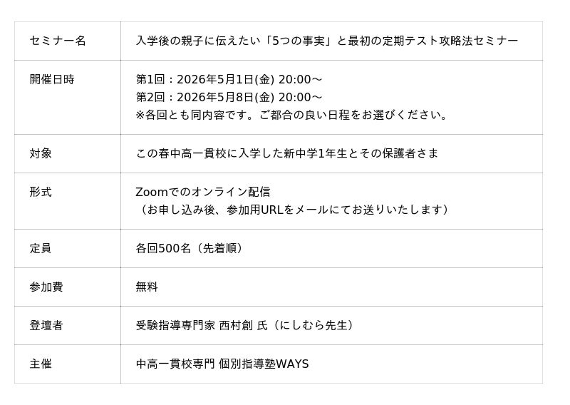 株式会社メイツ(本社:東京都新宿区、代表取締役:遠藤尚範)が運営する「中高一貫校専門 個別指導塾WAYS」は、2026年5月1日(金)・5月8日(金)の2日程にて、この春中高一貫校に入学した新中学1年生の保護者さまを対象とした無料オンラインセミナー「入学後の親子に伝えたい『5つの事実』と最初の定期テスト攻略法」を開催いたします。