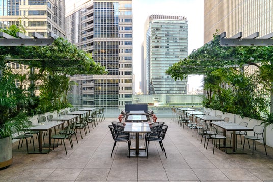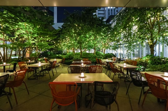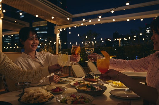 サンセットを望む開放的なテラスでは、昼は自然光と風を感じ、夜はDJによる音楽とともに、都心にいながら非日常の時間を提供します。