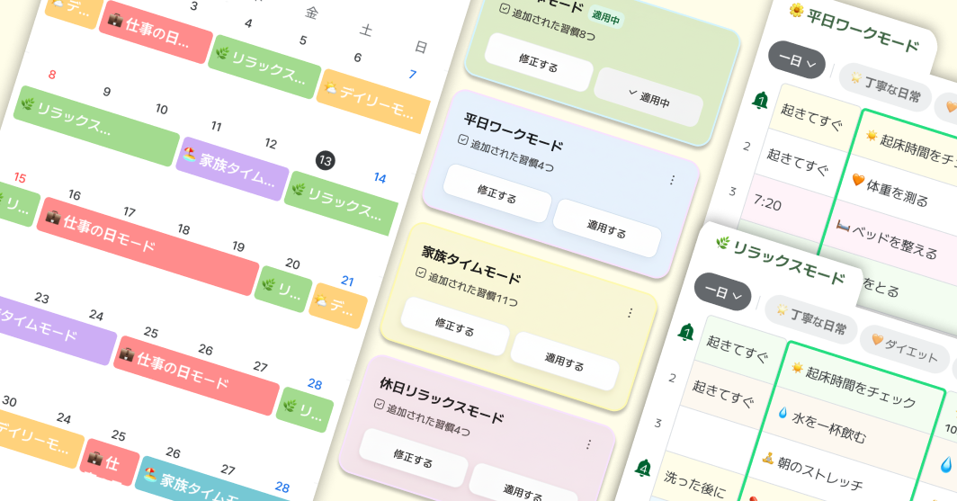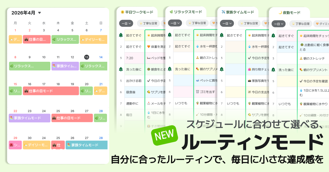 ルーティンモードとは、自分の生活パターンに合ったルーティンをあらかじめ複数保存しておき、状況に応じて自由に切り替えて使える仕組みだ。平日と休日でリズムが異なる会社員、授業期間と休暇期間でまったく生活が変わる学生、日勤と夜勤を行き来する交代勤務者、稼働日と休息日の密度が異なるフリーランサーまで。固定された一つのルーティンではなく、自分の実際の生活リズムに合わせて柔軟に設計できる点が、従来の習慣アプリとの決定的な違いだった。