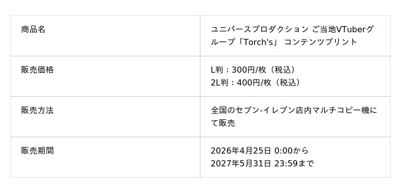 ユニバースプロダクション株式会社(代表取締役:浦田英博)は、全国のセブン‐イレブン店内でお買い求めいただけるマルチコピー機 コンテンツプリントサービスにて「Torch’s」新商品の販売をお知らせいたします。