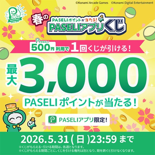 合わせて、KONAMIが運営する"遊べる電子マネー"「PASELI(パセリ)」にて、「PASELIチャージ機キャンペーン(2026年4月~5月)」を5月6日(水・祝)まで開催しています。期間中にキャンペーン特設サイトでエントリーをし、PASELIチャージ機でチャージをすると、最大500ポイントがもらえます。