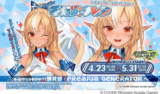株式会社コナミアーケードゲームスは、音楽ゲーム『DanceDanceRevolution WORLD(ダンスダンスレボリューション ワールド)』、『pop’n music High☆Cheers!!(ポップンミュージック ハイチアーズ)』、『SOUND VOLTEX ∇(サウンドボルテックス ナブラ)』の3タイトルで、カバー株式会社が運営する女性VTuberグループ「ホロライブ」所属の「不知火フレア(しらぬいフレア)」とのコラボイベントを4月23日(木)から開始していることをお知らせします。