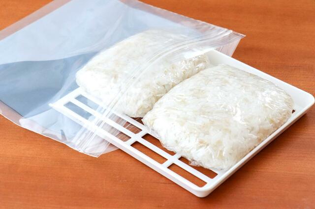 いつもどおりラップでごはんを包んだら、フリージングトレーにのせてそのまま保存袋に入れるだけ!