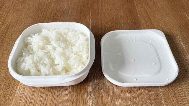 ラップだとほぐす作業が必要になりますが、容器で保存した分は、フタを開けると湯気がふわりと立ち、ほかほかと仕上がっている印象でした。