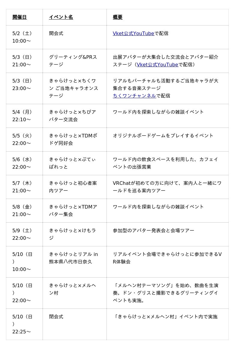 計9日間の期間中、毎日公式イベントが開催されます。ステージイベントの開催や、VRChatで人気の7団体のコミュニティとコラボし、キャラクターと交流できる様々な機会を設けます。