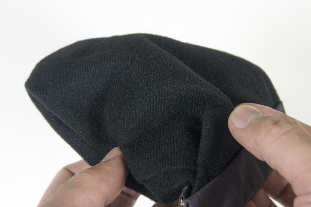 先ほどの「ループ付バネ口ポーチ」と異なる点は、大きさやポケットの有無だけでなく、裏返してみるとバネ口ポケット内にマイクロファイバークロスのような柔らかい素材が使われていること。