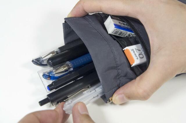 この形ならではの使い方として、ペンや定規などの棒状のものはバネ口ポケットに、消しゴムやシャーペンの芯はファスナーポケットに入れてペンケースとして使うこともできちゃいます。