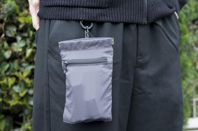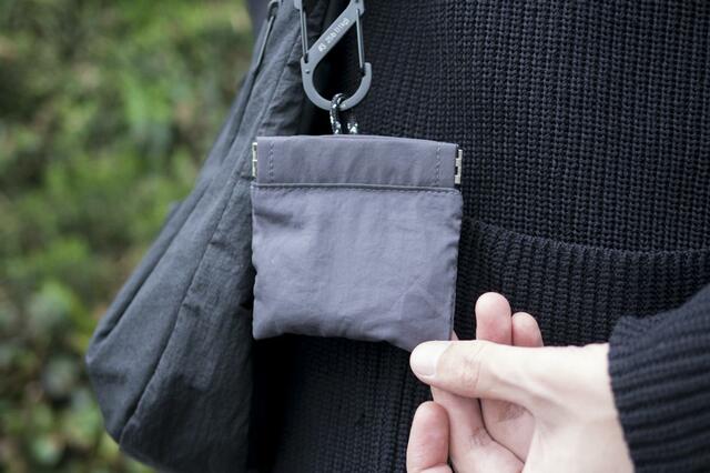 バッグの中で見失いやすい小物をすぐに取り出せるように、ループにカラビナを付けて「バネ口ポーチ」を吊るしてみたり。