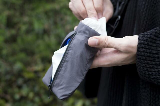 ポケットティッシュをセットすれば、ファスナーを開けてすぐにティッシュを取り出せて、ゴミはバネ口のポケットに入れておけるという、とても便利なポーチで、220円という価格以上の活躍をしてくれています。