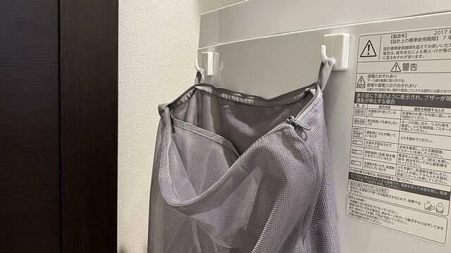 洗濯機にマグネットタイプのフックをつけてみるとこんな感じ。かなり容量があるので、1人暮らしなら洗濯かご替わりにも使えそう。