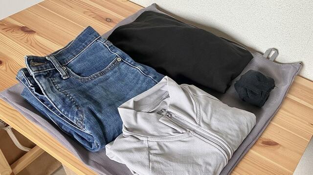 メインスペースにはジーンズ・UVカットパーカー、サブスペースにカップ付きインナー・スニーカーソックス・ショーツのインナー類をイン。