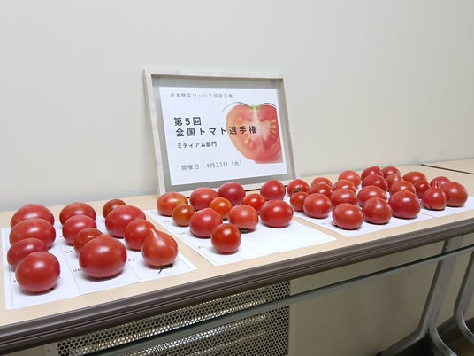 一般社団法人 日本野菜ソムリエ協会(東京都渋谷区、代表理事:福井栄治、以下当協会)は、2026年4月22日(水)に、農産物のさらなる価値向上を目指す青果物の品評会イベントとして「第5回全国トマト(ミディアム)選手権」(以下、本選手権)を開催しました。全国から集まったおいしさ自慢のミディアムトマト全45品の中から、評価員である野菜ソムリエが産地や品種、生産者などの情報をすべて伏せて食味。そのおいしさを審査し、もっともおいしい「トマト」を決定しました。全国青果物選手権では初めて、高校生が育てたトマトが最高金賞を受賞!非常にレベルの高い品評会となりました。