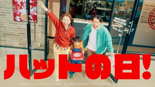 新CM「ハットの日」篇では、これまでのシリーズとは異なるポップでリズミカルな世界観の中、「ピザハット~がやってくる~♪」という耳に残るBGMに合わせてハット星人が軽快なダンスを披露します。続いて、「8・9・10はハットの日~!」というフレーズとともに、家族3人がピザをテイクアウトしてうれしそうに店を後にするシーンを展開。後半では、家族それぞれがピザを頬張るおいしそうなカットがテンポよく映し出され、最後は「ピザピザピザピザ お持ち帰りなら810円!」というリズミカルなフレーズで締めくくられます。楽しい音楽と軽快な演出を通じて、「ハットの日」のお得感とワクワク感を印象的に伝えるCMです。