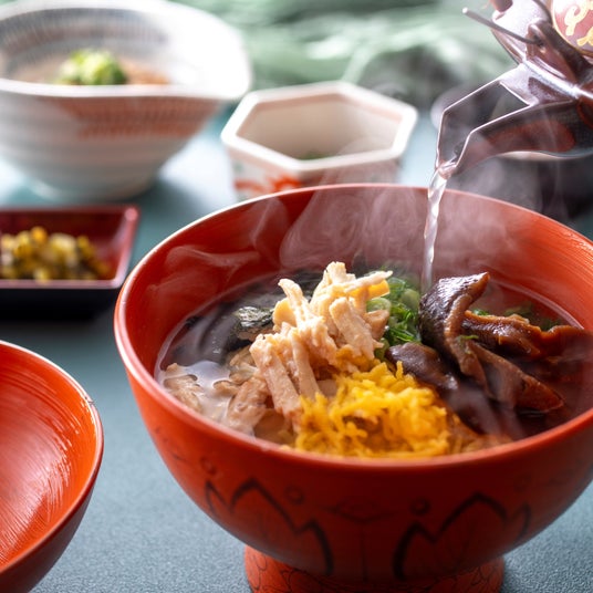 熱々のスープを注いで楽しむ奄美大島ゆかりの鶏飯