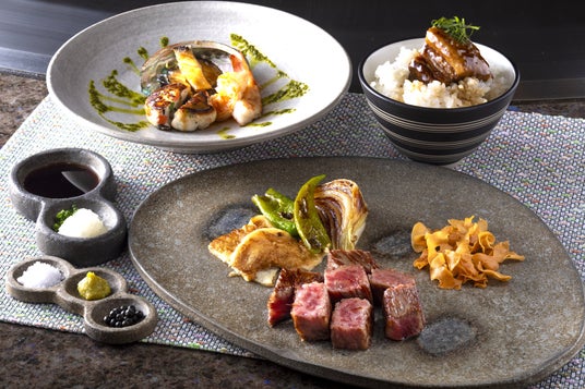 厳しい基準を満たした鹿児島黒牛“黒乙女5 5”のロース、または鹿児島県産黒毛和牛フィレをメインに選べる鉄板焼コース。前菜の鮑や海老、特製さつま揚げのソテーは、コクのある鹿児島県産醤油のバターソースで。黒乙女5 5 のステーキは、雌牛ならではのきめ細やかな肉質と軽やかな脂が魅力。締めは、鹿児島の醤油や黒糖、焼酎でじっくり煮た黒豚角煮丼をどうぞ。