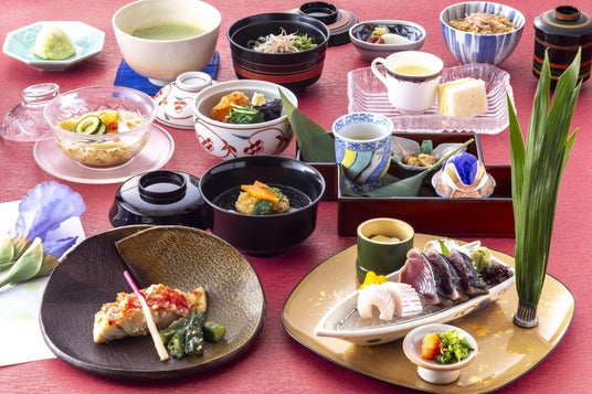 鹿児島食材や郷土の味を随所に散りばめた月替わりのコース。5月は、端午の節句にちなんだ晴れやかな仕立てでお迎えします。造りで旨みあふれる鹿児島県産鰹のたたきが味わえるほか、さつま揚げやかるかんといった鹿児島ゆかりの味も登場。旬の味覚とともに、薩摩に思いを馳せる優雅な昼膳をお楽しみください。