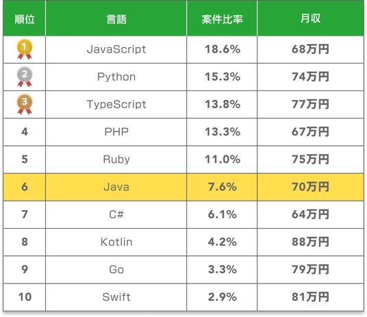 Javaはエンタープライズ向けシステム開発の定番言語で、金融・製造・官公庁など大規模システムで広く採用されています。長年の実績があり、安定した需要と高い報酬が見込める言語です。