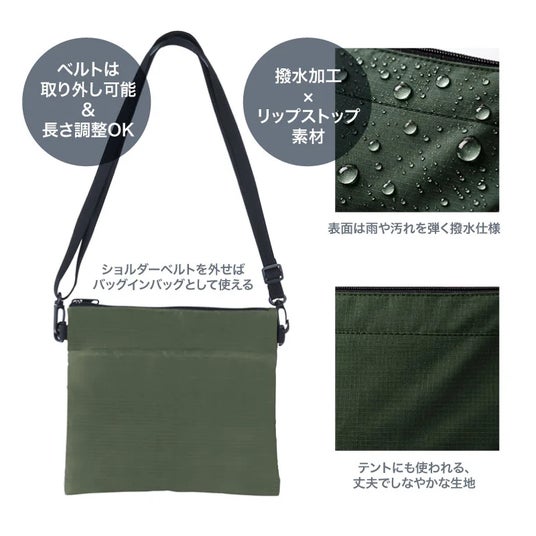 また、長財布やスマートフォンなどの貴重品をしっかり収納できるサイズ設計に加え、フロントポケット付きで小物整理も簡単。ショルダーベルトは取り外し可能で、バッグインバッグやポーチとしても使用できる柔軟性の高い仕様となっています。