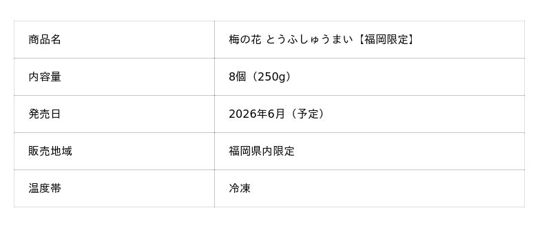 株式会社梅の花グループ(本社:福岡県久留米市、代表取締役社長COO:鬼塚 崇裕)は、看板商品である「とうふしゅうまい」を福岡県産素材を中心に再構築した【福岡限定商品】を発表いたします。