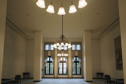 内装は、階段の手すりや腰壁の羽目板などの造作から家具調度品、照明器具、カーテン、金具ひとつにいたるまで明治のルネサンス調が丁寧に受け継がれ、歴史を感じさせながらも人の滞在をやさしく包み込む内部空間となっています。