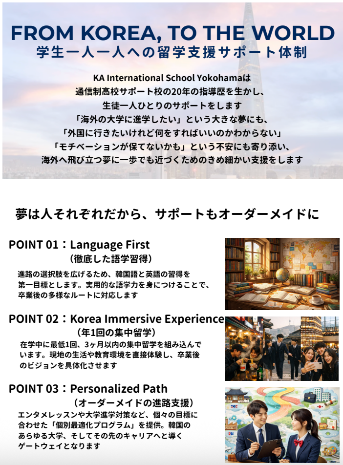 株式会社教育アカデミー(所在地:神奈川県横浜市、代表取締役:望月 彩)は通信制高校サポート校として、2027年4月、韓国留学に特化した通信制高校 KA International Yokohamaを開校し「韓国GLOBALコース」を新設します。20年にわたる指導実績を持つ教育アカデミーが満を持して送り出す、"好きを最強の武器に変える"教育プログラムです。