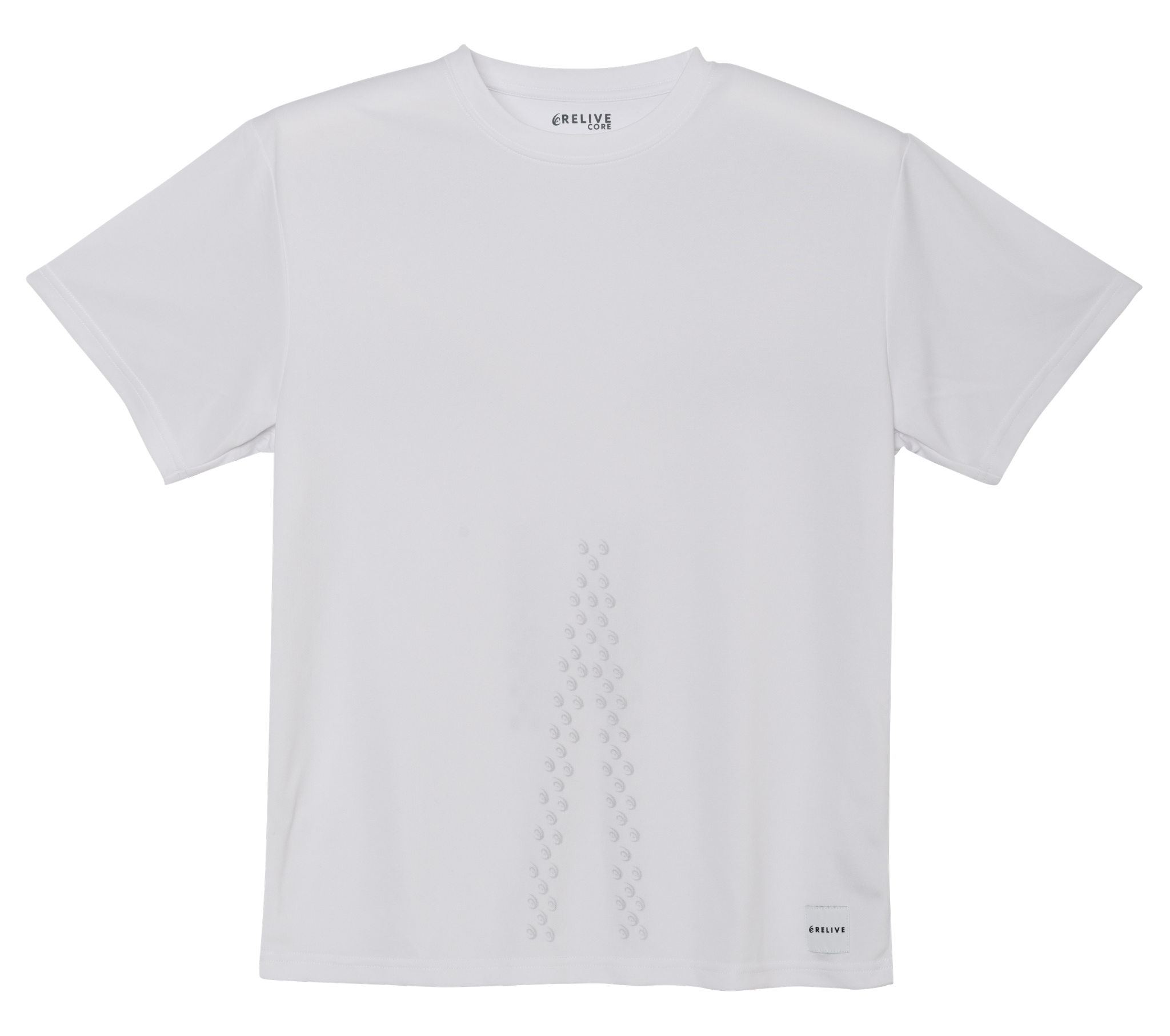 リライブシャツ コア(一般医療機器 医療機器届出番号:28B3X10040000011)は、一般医療機器に分類されており、従来のリライブウェアとは異なる仕様となっています。最大の特長は、セラミックを練り込んだ素材を使用している点です。この生地は、着用時の体温を吸収し、遠赤外線を輻射(ふくしゃ)します。その結果、シャツを着るだけで血行が促進され、「疲労回復」や「腰・肩などの筋肉のコリの改善」、「筋肉の疲れの軽減」といった効果が期待できます。また、身体のポイントに沿って鉱石プリントを配置する、リライブ独自の間接テーピング技術も採用しております。