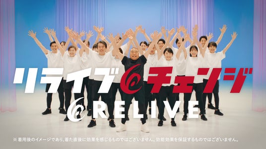 「歌篇」2024年の第一弾CMでも好評を得た演出を踏襲しつつ、新商品『リライブシャツコア』の機能性をより印象的に伝える内容にアップデート。「リライブでチェンジ!」の掛け声とともに軽やかな演出へ展開し、歌とダンスを通じて製品の特長と全額返金保証を印象的に訴求しています。