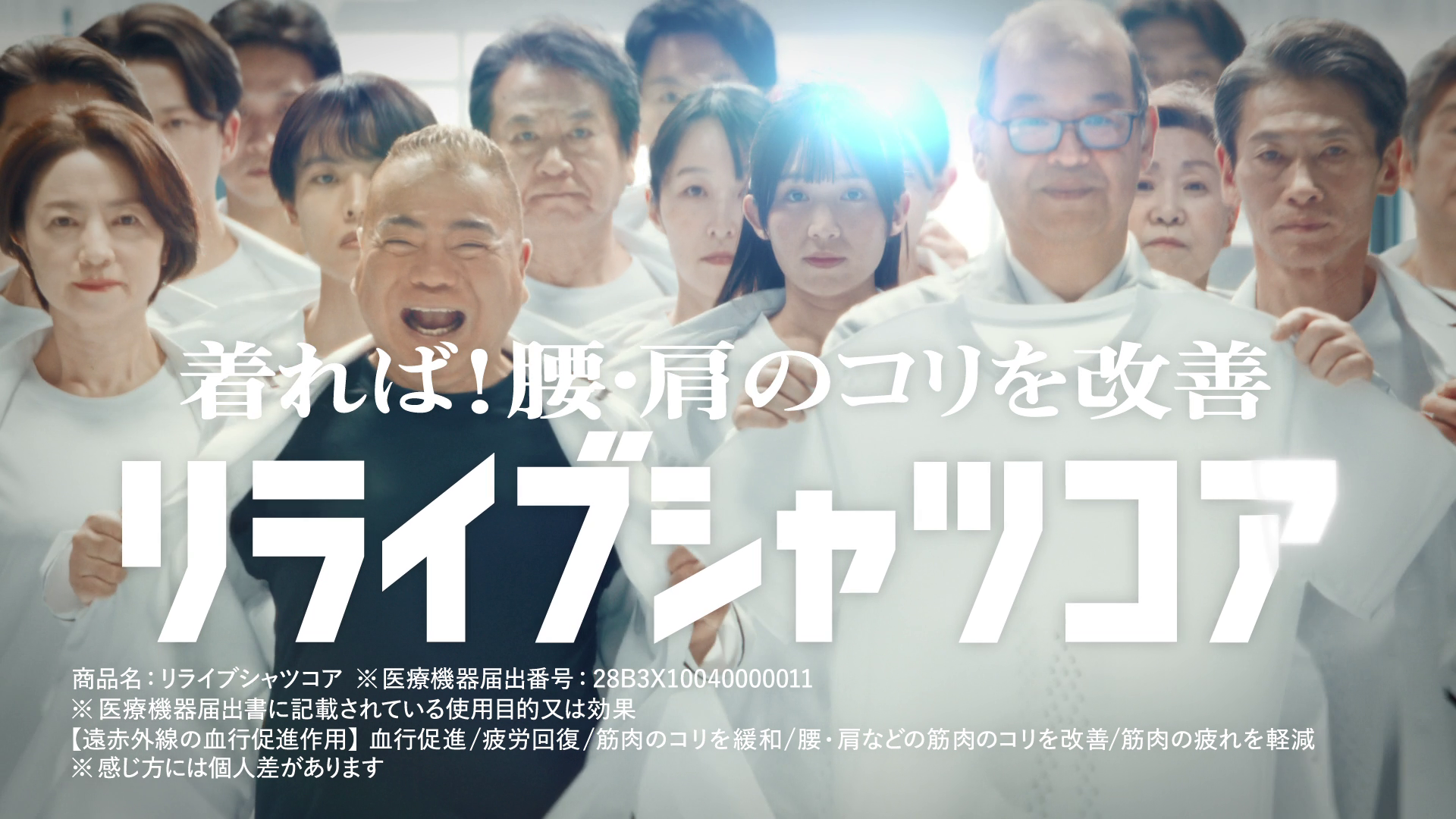 「登場篇」白衣姿の開発者と研究員がリズムに合わせて登場し、「着れば、腰・肩のコリを改善」「セラミック生地で血行をけっこう促進」という製品特長をテンポよく訴求。繰り返しの演出により、一般医療機器としての機能性と特徴を印象付ける内容となっています。
