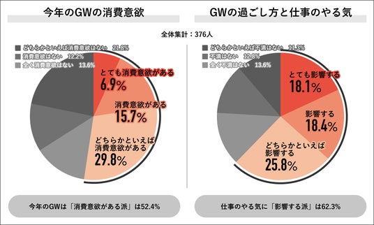 回答者全体の376人に、今年のGWの消費意欲を聞くと、「消費意欲がある派」は52.4%で過半数を占め、内訳は「とても消費意欲がある」が6.9%、「消費意欲がある」が15.7%、「どちらかといえば消費意欲がある」が29.8%でした。また、GWの過ごし方が仕事のやる気に影響するかを聞くと、「影響する派」は62.3%で過半数を占め、内訳は「とても影響する」が18.1%、「影響する」が18.4%、「どちらかといえば影響する」が25.8%でした。