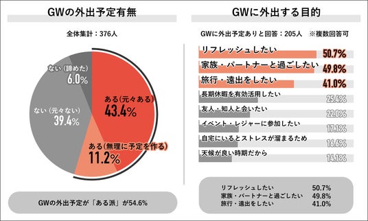 回答者全体の376人に、GWの外出予定有無を聞くと、「ある派」が54.6%で過半数を占め、内訳は「元々ある」が43.4%、「無理に予定を作る」が11.2%でした。外出予定ありと回答した205人にその目的を聞くと、「リフレッシュしたい」が50.7%で最多となり、次いで「家族・パートナーと過ごしたい」が49.8%、「旅行・遠出をしたい」が41.0%となりました。