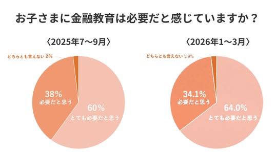 「子どもへの金融教育の必要性」を質問したところ、64%が「とても必要と思う」、34.1%が「必要と思う」と回答しました。2025年7月~9月の前回調査と比較すると、総数(98%)は変わらないものの、「とても必要」と答えた層が60%から64%へ増加。 こども支援NISAの制度創設や続く物価高、日経平均株価の史上最高値更新といった社会情勢を背景に、保護者の危機感や関心が一段と強まっていることが伺えます。