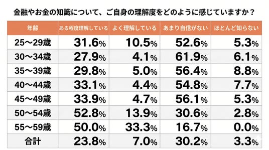 ・保護者自身の金融理解度は年齢に比例。30代前半では約7割が「自信なし」。