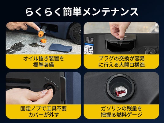 広い点検口、液だれ防止給油口、2通りのオイル排出方式を備え、メンテナンスの手間を大幅に省きました。