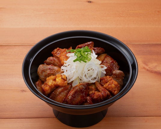 脂の美味しい大ぶりのホルモンと、肉の旨みを感じるハラミに旨辛ダレを絡めて焼き上げた、ヤミツキになる焼肉丼です。980円(税込1,078円)