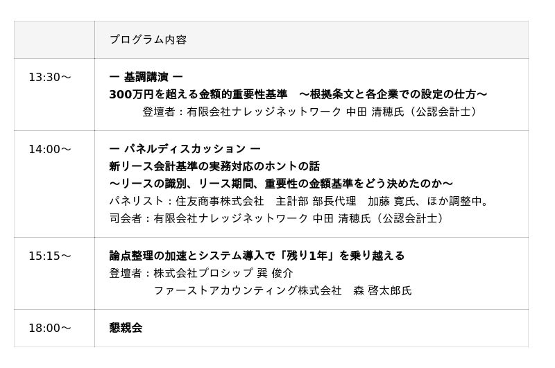 第2回となる2026年5月21日(木)は、多くの企業が頭を悩ませる「適用範囲の絞り込み」と「リース期間の短縮」にフォーカス。先行して新基準対応を進めている企業の「生の声」を直接聞けるパネルディスカッションや、担当者同士が悩みや課題を共有できる懇親会を通じて、一人では整理しきれない実務判断のヒントをお届けします。