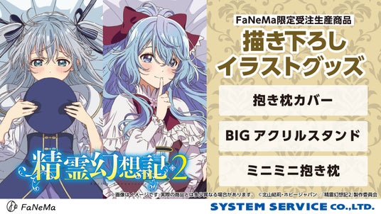 システムサービス株式会社(本社:東京都豊島区、代表取締役社長:田村宗弘)は、アニメ・マンガ・ゲーム作品等のキャラクター商品の企画・製作・販売をする自社ECサイト「FaNeMa」(URL:https://fanema.jp/)にて、TVアニメ『精霊幻想記2』より「抱き枕カバー」「ミニミニ抱き枕」「BIGアクリルスタンド」を発売いたします。