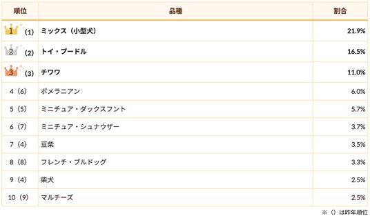 昨年に引き続き、ミックス(小型犬)が1位に輝きました!2年連続のトップ獲得ということで、その人気はいよいよ不動のものになりつつあります。
