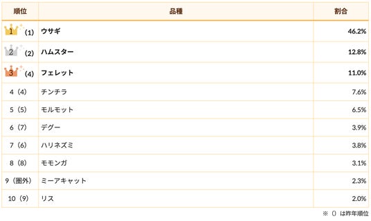 割合から見てもその人気がうかがえますが、長い耳にモフモフした毛並みという愛くるしさを考えれば、この人気も納得の結果です。