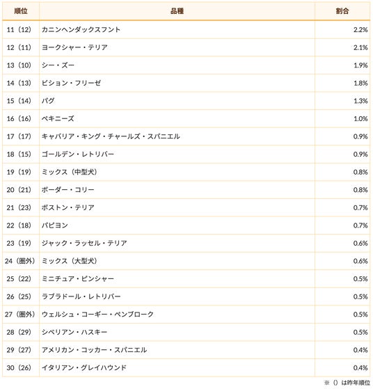 定番のトイ・プードル、チワワは昨年同様の順位をキープしており、安定した支持の厚さがうかがえます。